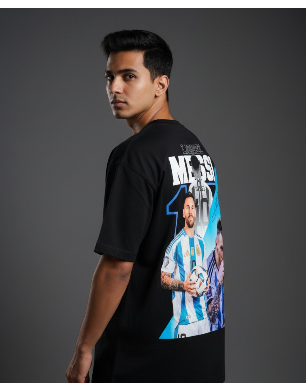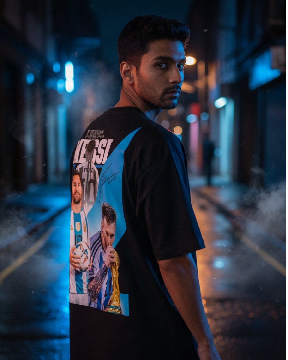 Celebrate the magician of world football with a bold back print that captures ice‑cold composure, record‑breaking brilliance, and trophy‑lifting glory. The Messi Legacy tee uses a high‑impact collage in national colors, framed with athletic typography for a match‑day statement. Printed using high‑fidelity DTF on dense 240gsm cotton, it delivers saturated blues, clean whites, and razor‑sharp detail—then finished with bio + silicon washes for day‑one softness and a structured drape. Fan art inspired; not official team or player merchandise.